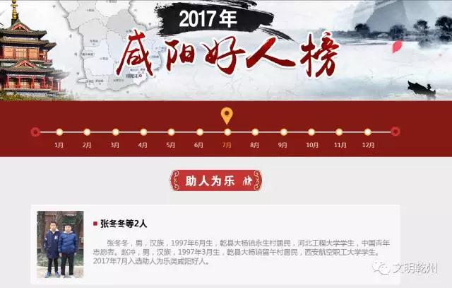 8月15日,咸阳文明办发布6-7月“咸阳好人榜”,我县张冬冬、赵冲荣登助人为乐类“咸阳好人榜”。