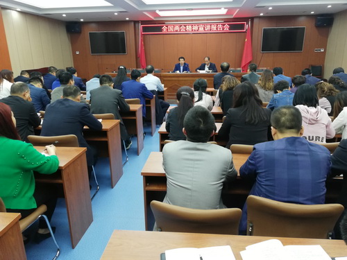 报告会上,韩志峰围绕全国两会概况、中央领导同志重要讲话精神、宪法修正案、监察法、政府工作报告、国务院机构改革方案等六个方面对习近平新时代中国特色社会主义思想提出的一系列新论述、新论断、新要求等进行了细致解读。