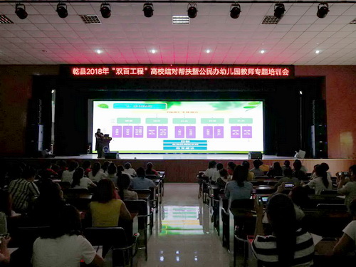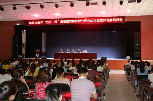 为了贯彻落实陕西省高校结对帮扶贫困县助力脱贫攻坚行动计划文件精神,认真落实《陕西服装工程学院 bet20365网址结对帮扶助力脱贫攻坚备忘录》工作要求,充分发挥高校专业优势,助力我县教育脱贫攻坚。6月15日下午,乾县2018年“双百工程”(即百所高校帮扶百县助力全省脱贫攻坚)高校结对帮扶暨公民办幼儿园教师专题培训会在我县职教中心隆重举行。教育局相关组室、全县公民办部分幼儿园教师200余人参加会议。