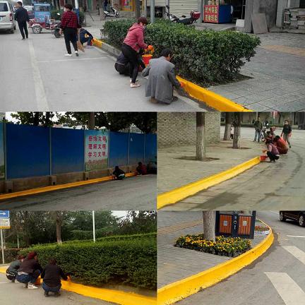 为了靓化街区城管执法局基建管理处对城区街道道路牙子用亮黄色快干漆进行粉刷装饰,共刷城区道路牙子近40000米。刷漆涂层表面具有优越的耐候性,对混凝土路缘石能长久保护,既显现了道路轮廓界面,又美观醒目,整洁有序。