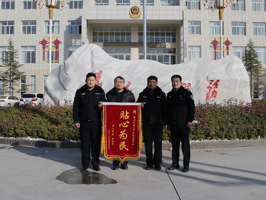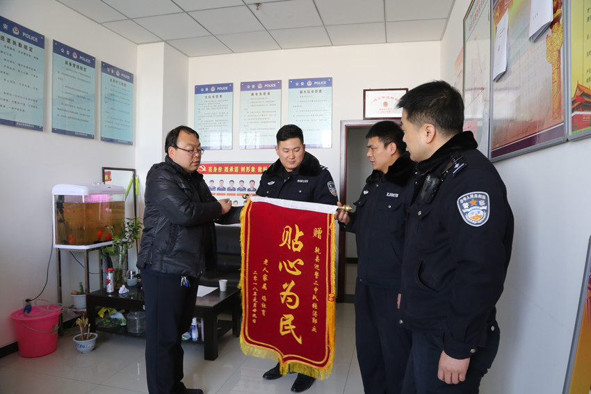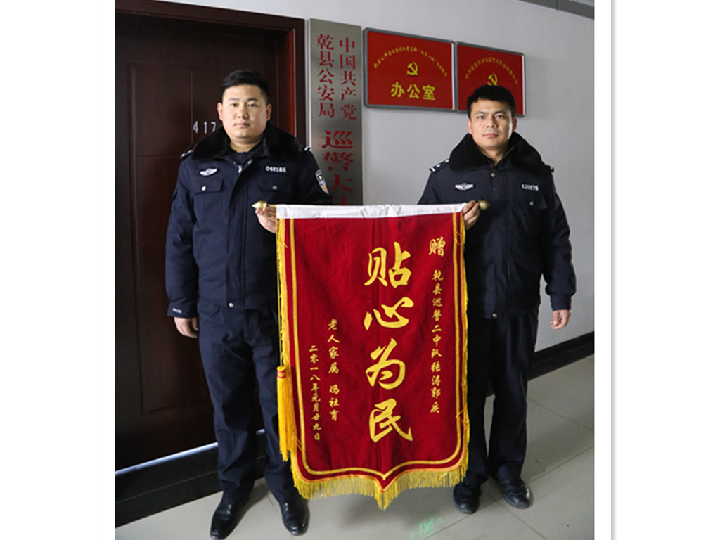 事情虽已过去数日,但是老人念念不忘民警张超、郭庆的救助。1月31日,老人的儿子带着老人的浓浓谢意来到县公安局,手捧锦旗送到民警手中,衷心表达老人及其家属的感激之情。