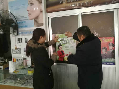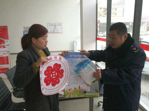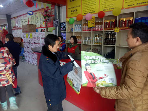 2月9日,通过集中发放创建“宣传日历画”、张贴“放心消费创建笑脸花”、致广大经营户的一封信、12315维权宣传资料等多种宣传方式。并向经营户和消费者宣讲放心消费创建知识,使更多群众了解创建工作,使更多经营者参与创建活动,使更多商家因了解创建而加强自治自律,使更多消费者因知晓创建而增加消费信心。同时对经营场所进行了检查,查看是否有无照经营现象,是否有销售假冒伪劣商品现象,为群众放心消费、安全消费提供节日保障,使广大人民群众真正成为放心消费创建活动的受益者。