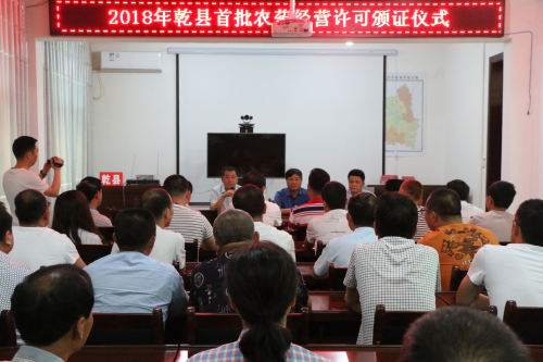 5月31日下午,农牧局举行了2018年乾县首批农药经营许可颁证仪式。市药检所所长郭建挺,县农牧局局长吕科娃、原工会主席邵智斌、全县从事农药经营的企业、门店60余人参加了会议。
