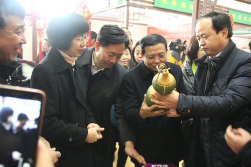 陕西省供销合作总社主任陈纯山、市长卫华在我县站台前查看盘州葫芦工艺品