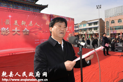 会上,县委副书记赵俊强宣读了《关于命名表彰2016年度"最美乾县人"和"首届文明家庭"的决定》。授予张小锋等5名同志为"最美儿女";授予孙会歌等8名同志为"最美媳妇";授予刘白菜等7名同志为"最美公婆";授予屈哲等5名同志为"最美平安卫士";授予魏云肖等5名同志为"最美环卫工人";授予苏争兵等4名同志为"最美乡村医生";授予李金团等5名同志为"最美基层工作者";授予高娟等4名同志为"最美工人";授予王科军等4名同志为"最美交通人";授予殷雯同志为"最美导游";授予乙辽宁、刘阳2名同志为助人为乐道德模范;授予杜组组等3名同志为"最美志愿者";授予覃健森等4名同志为诚实守信道德模范;授予郝洪涛等3名同志为"最美军属";授予黄建军等5人为助人为乐先进集体;授予杜新虎等6人为见义勇为先进集体;授予安俊峰等14人为见义勇为先进集体;授予郭锋等10户家庭为"首届文明家庭"。