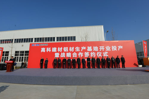 12月19日,高科建材(咸阳)铝型材生产基地开业投产暨战略合作签约仪式在乾县工业园区举行。中国建筑金属结构协会会长、西安建筑科技大学副校长郝际平,陕西省质监局副巡视员宋艺光,咸阳市委常委、副市长郭军,市质监局局长葛升群,乾县县委书记杜润民,县人大主任张社教,县长焦志鹏,县政协主席巨振宏,县委常委、统战部长师虎,副县长苟晓瑜及西安高科集团总经理兼党委副书记贾长舜,西安高科集团党委副书记牛跃进,陕西省建筑设备与门窗协会会长王召全,西安高科集团副总经理、高科建材董事长祝社宁等领导和嘉宾出席会议,县长焦志鹏主持投产仪式。