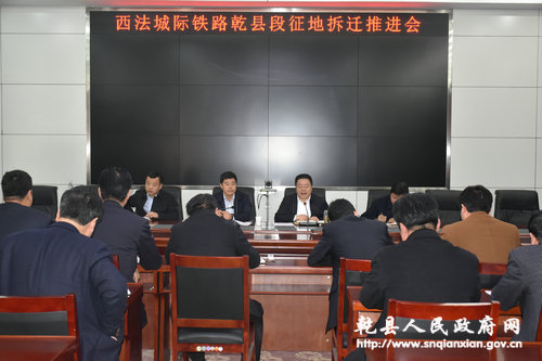 3月1日下午,县长焦志鹏主持召开西法城际铁路乾县段征地拆迁工作推进会,项目承建方、政府办、财政局、交通局、国土局、公安局、城关街办、新阳镇等单位负责人参加会议。