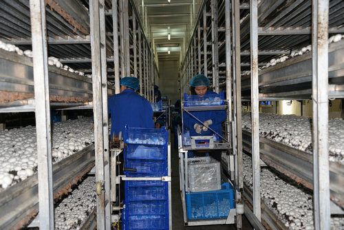焦志鹏一行先后到双孢菇智能工厂化高效生产及深加工技术研发中心、现代化高效灭菌检测体系、双孢菇种植采摘基地实地查看,对双胞菇生产从菌丝原料选择、培养、成品、采摘、储存、冷链物流等全产业链进行了细致了解。到淮安涟水县裕淮菇业有限公司扶贫产业基地项目建设施工现场,详细了解扶贫基地的建设规模、运行模式和产业带动情况。