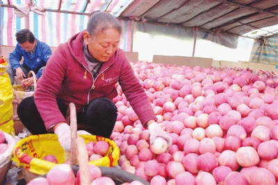 今年58岁的赵上利是官地村的苹果种植大户,也是村里双矮苹果种植协会会长,刚采摘回来的苹果就贮藏在家门口的塑料棚内,红彤彤的苹果齐刷刷摆放了好几层。“暂时在这里存放几天,已经订给了宁夏的客商,每斤3元。”赵上利说,“仅苹果这一项,今年家里的收入能达到10万元哩!”