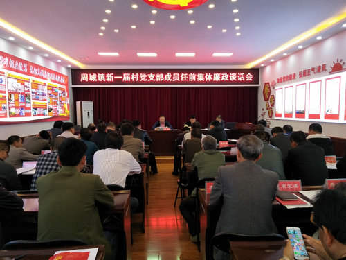 按照换届选举程序,周城镇已完成支部换届全部程序,选举出了七个支部新一届支部成员。4月18日下午,周城镇召开新一届党支部成员集体廉政谈话会,全镇机关干部及七个村换届选举产生的新一届党支部成员参加了会议。