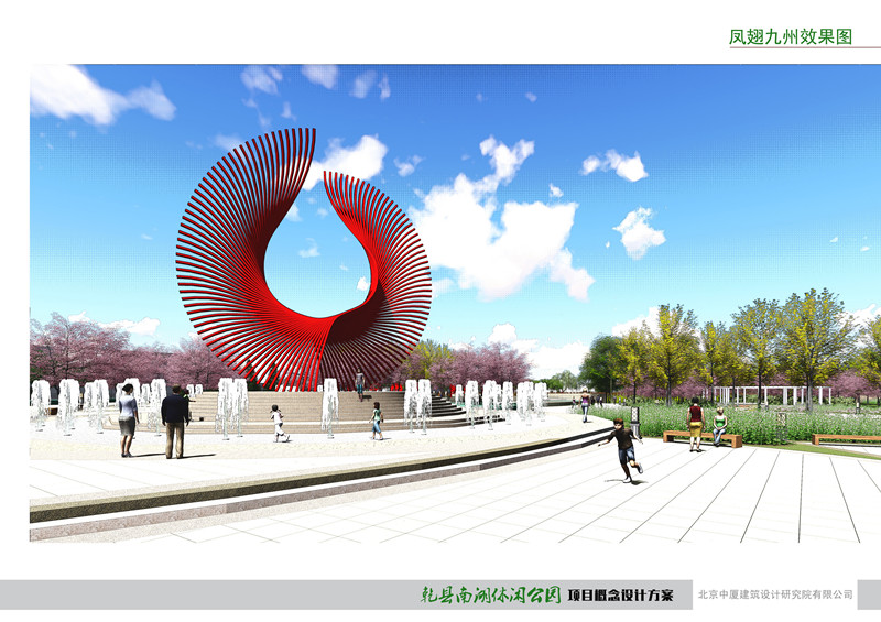 乾县南湖休闲公园位于乾县县城南向,是乾县县城的南大门。项目用地西临乾普路,东临黉学街,南临南二环;总占地面积约39800平米(约59.7亩),整体呈长方形,西高东低,地势较为平坦。项目周边交通便利,地理位置优越;周边住宅小区、村落较多。南湖休闲公园作为乾县的南大门,在提高县城整体品位的同时,亦可为周边的群众提供一个平时休憩游玩的休闲性公园。 经初步筛选,确定了南湖公园的两套征求意见设计方案。现将这两个方案的相关图片进行公示,请大家积极参与方案的选定,以便南湖公园建设工作加快推进。 【方案一】 设计思路:采用“日月当空,普照大地”为主题,以凤凰为载体。通过主题与项目的结合,将公园整体规划为日、月两区,日区为以“凤翅九州”主雕塑为核心的广场展示区,月区为以月牙湖为中心的生态游园漫步区。日、月两区通过一些独有的设计手法,最终以凤凰的形态展示给大众,体现出一代女皇所独有的坐拥日月的气势与魄力。